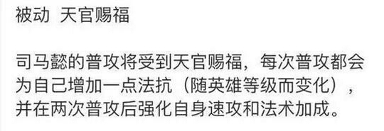 被动技能叫做:天官赐福,这个被动技能让司马懿有着连续输出能力,强化自身的攻速和法术加成,可以说让法师英雄如鱼得水的状态。