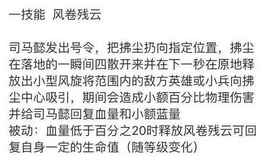 一技能叫做:风卷残雪,司马懿释放做自己的佛尘形成小型龙卷风,将敌方英雄或小兵吸引到龙卷风的中心,(更像露娜的二技能,)有恢复司马懿自身的血量值与蓝量,这个就很强的了,法师自带吸血技能可以说更加强悍一些。