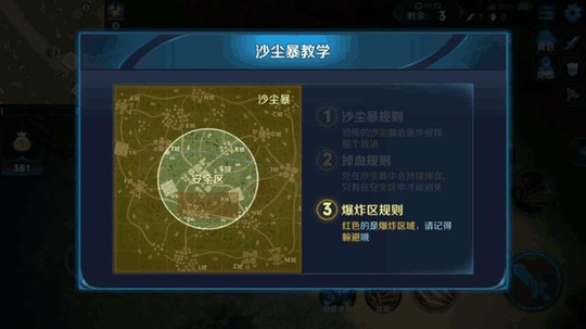 该模式与绝地求生一样也有爆炸区(毒区)和沙尘暴(类似绝地求生轰炸 ),玩家需进入安全区。