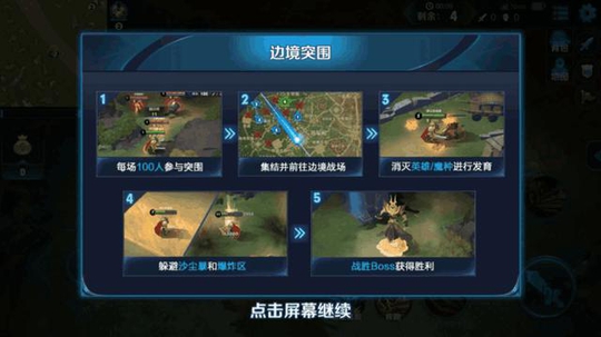 该模式与绝地求生相似,都是采用组队的方式,每场100人参与突围,人员集结够之后前往边境战场。玩家可先打怪、搜集装备或者击杀其他英雄进行发育。