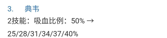 典韦削弱的比较在意料之中!二技能吸血从一直都是50%削成了每一级都不一样!现在是二技能一级50%后面再由25%递增到最多40%!