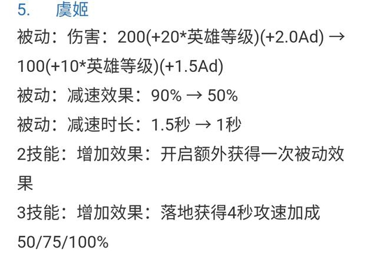 也不知道虞姬怎么了!不温不火的她这回被动伤害削很多!而且减速也削了!但是二技能和大招却加强了,尤其是二技能增加了一次被动效果!不知道这样的调整算怎样!