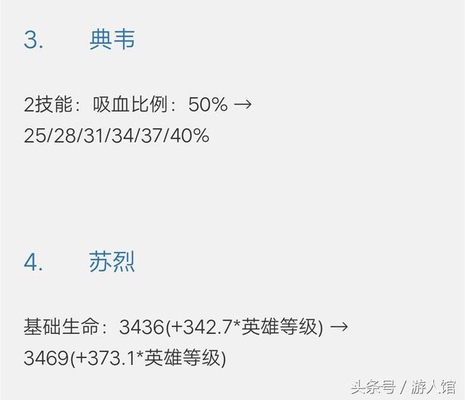 下面被削弱的就是最近这段时间非常强势的典韦了,削弱后的二技能的吸血效果和以前相比完全不能同日而语,光指望这个来回复血量以及强耗对方就有点不太现实了,可能大家需要出一些吸血铭文或者装备来弥补这个缺陷。