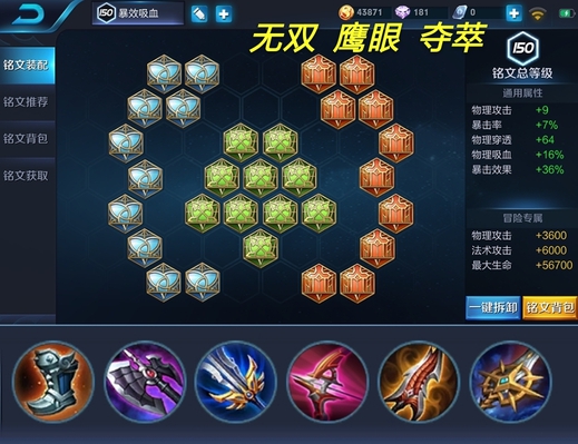 最后,带来暴击流虞姬的出装和铭文。铭文:“无双,鹰眼,夺萃”,出装:“攻速鞋,黑切,无尽,破军,破晓,宗师”。暴击流,一发暴击加上自带的16%吸血,不用出吸血类装备,普攻就能回挺多的血量。这个装备是技能穿透加普攻暴击双完美出装,技能伤害比百穿流低一点,但是普攻比百穿流强很多(绝不是一丁半点的)。如果追求更极致暴击,可以把黑切换成电刀(被动的电流伤害暴击了会有1000左右的伤害,也是不容小觑)或者苍穹(更加保命)。如果比较怕死的,非要出点吸血装备的,可以把黑切换成末世(普攻打肉更痛,百分比伤害。)或者制裁(克制吸血类英雄)。出装,看阵容,不是一成不变的,不要对面有程咬金貂蝉橘右京杨戬蔡文姬这种的,还不出个制裁,那你意识就有点差了。