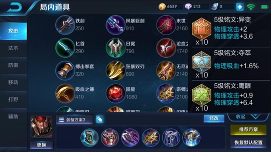 因为二技能所增加的吸血比例已经减少了,所以铭文方面笔者推荐异变+夺萃+鹰眼,这样才能在团战中有超强的续航能力!装备则是上面这一套,前期出一个反甲,就算是对上老夫子也是不怂,然后来上暗影战斧和黑切,在团战之中切后排伤害已经够了,并且因为真伤的原因,打肉的话也是很疼,因此最后面可以来两件防御装,魔女斗篷以及复活甲!