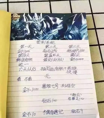 这是一位小学生玩家做的王者荣耀笔记(签到系统),第一天能领到什么,第二天能领导什么,本子上写的清清楚楚,金币,钻石,铭文碎片,皮肤,每一样都精打细算。