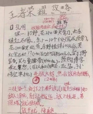 尽管玩这游戏的小学生玩家很多,但是从这些笔记中,我们看的出来,其实,他们还是很用心的,我们很多打游戏时为了泡妞,小学生这方面就比咱们专一多了,尽管十个小学生九个送人头(还有一个在挂机),但是,就冲你们这态度,以后,上黄金,指日可待!