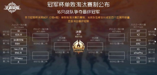 王者荣耀冠军杯:赛制正式出炉,BO7单败淘汰,下半区仅XQ/eStar驻守