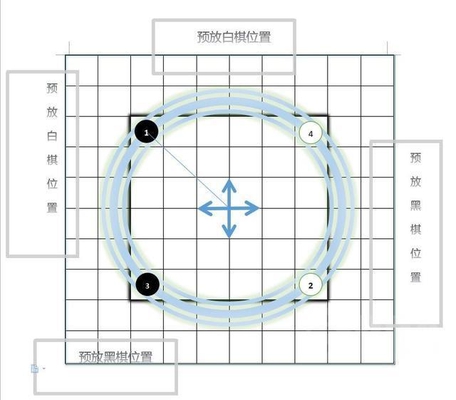 利用技能指示器预判棋盘内生成的4颗棋子落点位置是玩好弈星大招的关键,其中最重要的就是第一颗黑色棋子,它在棋盘成型之前产生,也就是说,如果能够利用好这颗黑棋,可以在棋盘成型前封锁棋盘内敌方撤退路线。如图所示,3技能指示器圆环范围实则4枚棋子的位置,第一颗黑色棋子出现于准星左上方,因此提前在棋盘上方或左侧铺置白棋,可以在棋盘边缘产生爆炸,起到减速的效果,增大将敌人留在棋盘内的可能。同时,弈星的三个技能全都可以取消其他技能的后摇,操作熟练的弈星,可以在短时间内打出白-黑-大-白-黑,共计5次技能,触发4次爆炸。另一方面,由于大招的施法硬直较长,弈星在施法期间格外容易受到对方的威胁,尽量配合被动使用。