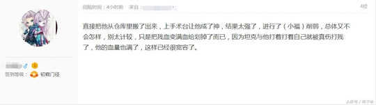 玩家至尊宝大人:直接把他从仓库里搬了出来,上手术台让他成了神。结果太强了,进行了(小福)削弱,总体又不会怎样,别太计较,只是把残血变满血给划掉了而已,因为坦克与他打着打着自己就被真伤打残了,他的血量也满了,这样已经很宽容了。