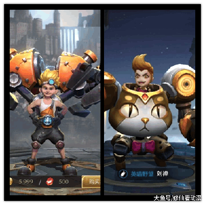 廉颇唯一的皮肤和这个家伙相似之处就是:都是石头构成的,嘴巴都咧得很大,眼睛发光手臂粗壮长着角,而且廉颇这个皮肤以前是绿色的,和朗博初始皮肤配色也很相似。
