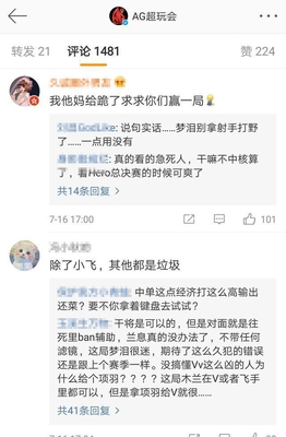 对于AG超玩会的再次失利,网友们似乎失去了耐心,在AG微博下面发泄自己的不满,甚至有网友已经失去了理智,说到:“我他么给跪了,求你们赢一局”,“除了小飞,都是垃圾(虽然说得过激了,但是小飞的表现的确可以)”