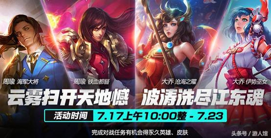 同时还有一个江东活动,在7月20号到22号,登录可以得到盛夏三国礼盒和一些小东西,而在17号到23号,参与对局和击杀小兵以及使用大乔孙策也能得到盛夏三国礼盒,这个礼盒中有机会得到永久的周瑜,大乔和他们的皮肤,当然大部分人应该得到的是碎片,钻石,体验卡,大家都懂。