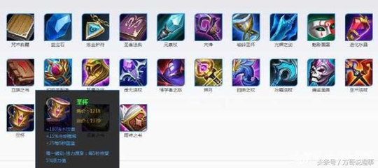 还有,另一件更重要的装备:圣杯,也是要卖掉的!前期购买这件装备能翻倍续航能力,为法师的清兵、支援提供法力保障,不至于让自己处于缺蓝的尴尬境地。但到了后期,法师最重要的就是输出。那时法师不需要到处游走,法力增长速度一般也跟得上,甚至万一怕缺蓝,那就提前打好蓝buff还能为自己减cd。但圣杯因为输出有限,最好是换成贤者之书。