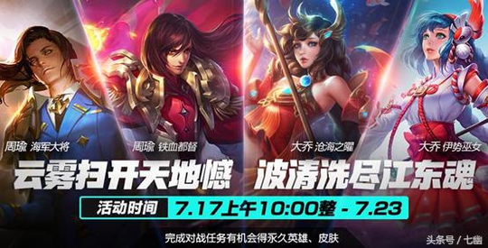 这个活动类型也是常见的了,不过这次也许概率会高一些吧,毕竟只是永久英雄和俩个永久伴生皮肤,天美要是这个概率都拉那么高,我觉得你对不起我们平民玩家了,真的!这个活动在周末连续登录三天可以获得一个宝箱,每天实战也可以获得宝箱掉落,使用大乔和孙策也可以获得宝箱,宝箱可以开出永久周瑜、大乔以及永久周瑜、大乔288皮肤。话说大乔老公还没上线,就拉着妹夫来做活动了,厉害吧!