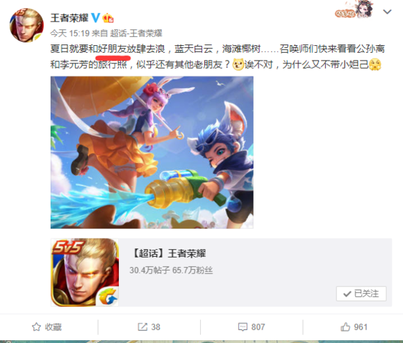 王者荣耀夏日皮肤已经公布出来几天了,但始终没有一个确定的上线时间,大家也一直在猜公孙离与李元芳的关系,在今天下午官博发布微博,配图很正常,是新的两款皮肤的海报,而文字部分,小编注意到官博说的是和好朋友一起去浪一夏,所以小编推测,可能这两款皮肤不是像之前猜测的作为情侣皮肤登场。