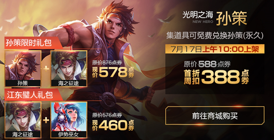 江东小霸王孙策也将于明天上线正式服,相信很多小伙伴已经集齐了钥匙,但没有集齐的也不要担心,这个英雄会同步上架商城,售价13888金币,同步上线的除了捆绑销售的英雄+伴生皮肤外,小编发现孙策和大乔的288皮肤同样打包成礼包会上线售卖 ,并且价格是原价的8折,没有买过大乔288皮肤的小伙伴可以在这个时候考虑入手一下,价格也是相对来说比较优惠的了。了解更多资讯。敬请关注王者快报。