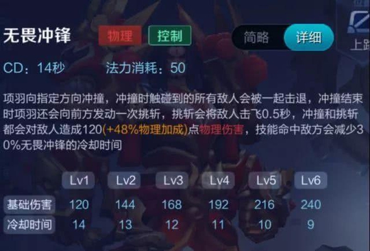 熟练使用1技能是玩好项羽的必要条件。1技能伤害分为两段,一段是击退伤害,一段是击飞伤害,两段伤害相同。 无论被项羽推了多远,永远是最多两段伤害,这点和苏烈的2技能不同。因此要把伤害打满,不一定需要靠近发动突击。