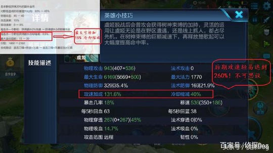 而且,大招增加了落地攻速补偿,满级后更是直接翻了一倍的攻速,虞姬的大招CD极为短暂,大家都是有目共睹的。所以重做后的虞姬依旧可以走爆发流,而且到了后期有大招攻速加成,相信团战输出能力也将会大大提高。而且打野刀可以提供最高达15%的减CD效果。再加上暗影战斧和碎星锤就可以达到40%满CD了,这个时候只需要从上路抵达中路的时间就可刷新所有输出技能。