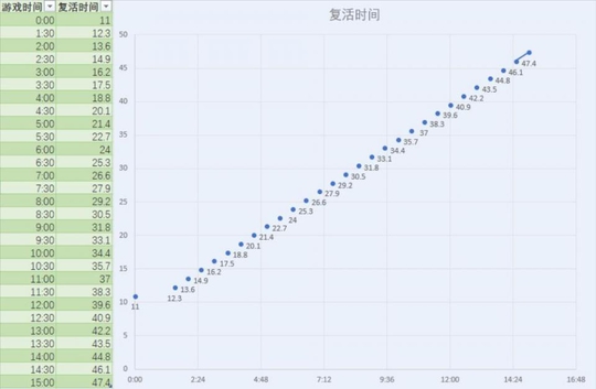 补充:1分钟前复活时间固定11秒,1分钟后,每隔30秒,复活时间增加11%左右,也即1.2~1.3秒左右的时间。到了15分钟后,复活时间固定为47秒。