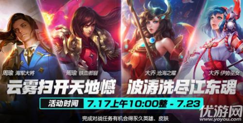 2、 盛夏三国,对战有礼~完成对局有机会得周瑜、大乔永久英雄、皮肤。