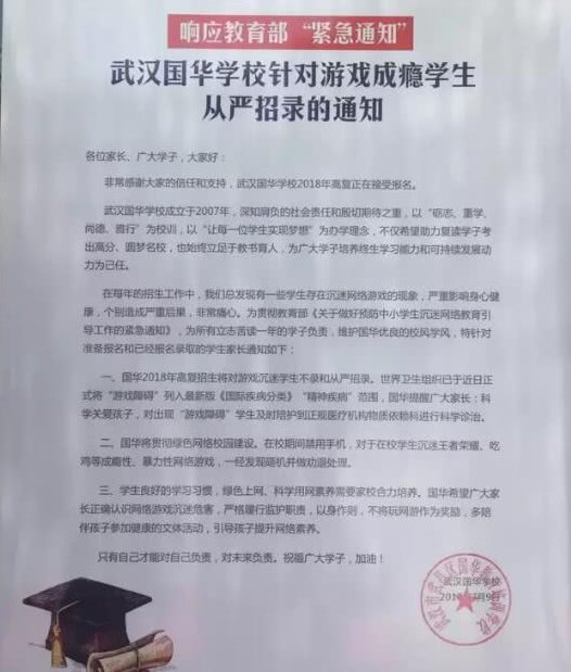 正是因为如此,这所复读学校经研究规定拒绝接收患有严重手游上瘾症的学生,并且在进入学校以后,需要学生和家长共同签署一份学校的协议书,其内容规定:“在校期间禁用手机,对于在校学生沉迷王者荣耀、吃鸡等成瘾性、暴力性网络游戏,一经发现砸机并做劝退处理”这也从根本上防范了学生沉迷手机游戏的问题。