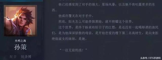 这是一个英雄与美女的爱情故事,这是一个正派与魔族之间的爱恨情仇,孙策在历史上英年早逝,在王者里面,因为大乔的指引而活下来,大乔的台词里面就有:守望着天空,大海和你的回忆;孙策的则是:化作天空和大海,守护你的回忆!
