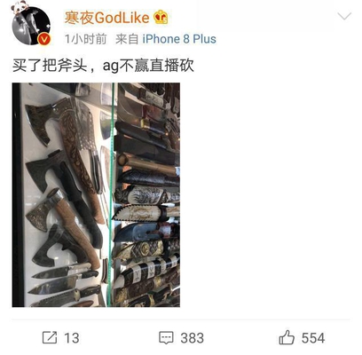 在AG超玩会还在比赛时候,AG超玩会曾经的教练——寒夜发下毒誓,如果AG超玩会这场不赢,直播砍,然后配上一张犀利的照片,看着挺吓人,全是些锋利的斧头。