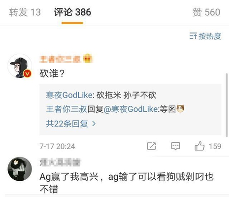 寒夜估计心里也是一肚子气,网友问道,准备砍谁呢?寒夜直播回答道:“砍拖米,孙子不砍(这孙子指的?)”更有网友调侃道,AG赢了我高兴,AG输了。。。