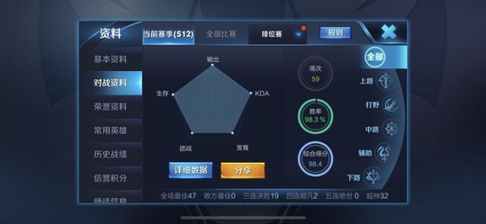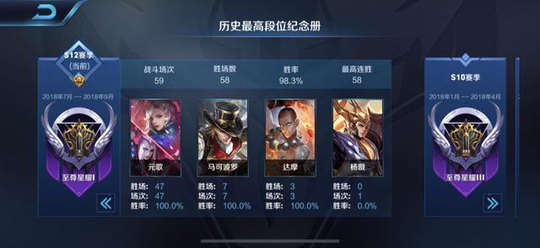 从他元歌胜率我们可以看到,四十七场元歌居然一盘都没有输,如此看来,德古拉对于元歌这个新英雄的熟练度已经达到如火纯青的地步了。最为恐怖的是,这个主播不仅元歌新赛季未尝一败,使用马可波罗以及达摩的时候依旧是百分百胜率。而后看了他的新赛季排位状况:五十盘游戏胜率达到98.3%。换句话说在这五十局排位中他仅仅只输了一把比赛。