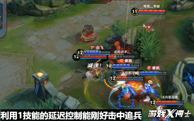 其次,虽然1技能的延迟控制主要是用来接大招,但在逃跑的时候 这个延迟能正好击飞追击的敌人, 对方只能眼睁睁看着人头溜走了。