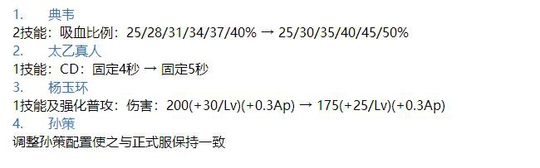 最后就是体验服今天更新,更新后调整了4个英雄,典韦的吸血能力回调了一点,太乙真人的1技能cd增长,杨玉环的伤害削弱,孙策和正服配置一样。