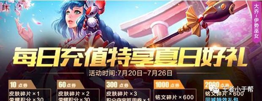 与新皮肤一同上线的还有每日充值活动,玩家可通过该活动快速积攒皮肤碎片,不同是这次的额外奖励还包含了永久回城特效礼包,预计又是上分大吉之类的!