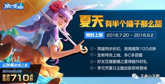另外全新热夏限定皮肤—公孙离蜜橘之夏于明日0点正式登场,限时上架45天,新皮肤首周710,拥有全图展示背景、专属音效和桔汁特效,关于皮肤具体细节和实战演示小编已有过专题介绍此次就不再赘述,当然对限定不感兴趣的小伙伴也可选择花间舞,该皮肤在颜值和特效方面不输高级皮肤,而且本周使用28个皮肤碎片即可兑换!