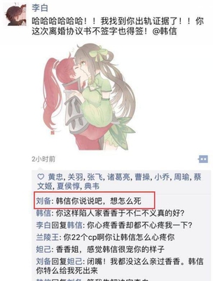 至于这一波下面的评论,就真的是更厉害了,什么爱是一道光,绿到你发慌,也是很服气了。然后是李白哥哥,发了一张韩信和孙尚香的合照,说是找到了韩信出轨的证据。