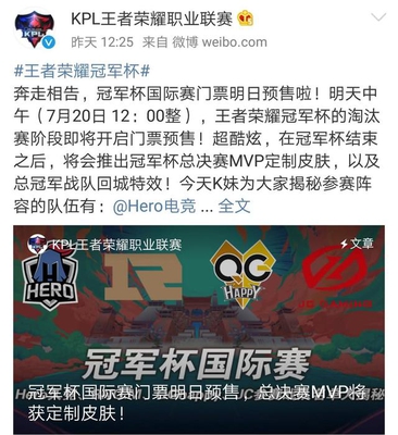 而这次官微竟然发布了一条王者荣耀冠军杯奖励的消息:冠军杯国际赛门票将于明日预售(也就是今天),而且在冠军杯结束之后,将会推出冠军杯总决赛MVP定制皮肤,以及总冠军战队回城特效!