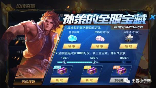 此次活动持续到7月23号结束,玩家除了每日可以必得铭文碎片、钻石和1个英雄碎片外,还可以通过完成全服任务领取三重宝藏,其中初级宝藏可开出永久大乔、头像框或英雄碎片等,中级宝藏可开出永久皮肤大乔伊势巫女或新品皮肤抽奖券,而高级宝藏则可以开出永久史诗皮肤小乔缤纷独角兽或曹操超能战警等!全服任务每日刷新,今天的任务为全服玩家使用孙策1000万次,截止至目前还未做满,因此小编试开了前两个宝藏,分别得到金色闪光击败特效3日卡和2个英雄碎片!
