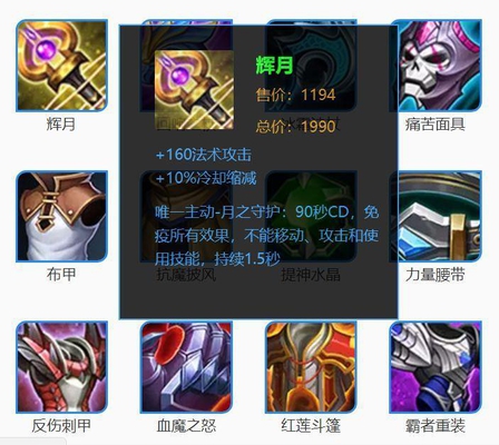 第二个是辉月 。辉月是主动技能,主动释放后,1.5秒之内免疫所有效果。在当前版本,辉月基本是法师的必备装备,因为它提供法强、冷却缩减,还能有效增加法师的生存空间。一些操作比较秀的刺客,出辉月骗技能也是不错的。