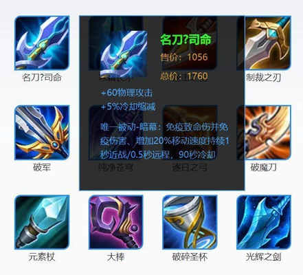 第三个是名刀 。名刀的优点是价钱比较便宜,可以提供60物理攻击和5%冷却缩减。名刀并不一定要后期出,像橘右京这种英雄,在前中期就可以做出名刀了,很容易完成残血反杀。名刀还有一个作用是跟复活甲搭配,完成复活甲秒换名刀的操作,成功续命。