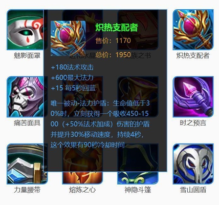 。这是一件非常冷门的装备,出了这件装备,英雄的生命值低于30%时,会立即获得一个护盾,并提升30%的移动速度,持续4秒。所以部分法师以及鬼谷子这种法系伤害的辅助,都可以考虑出个炽热支配者。