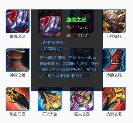 最后一个是血魔之怒 。其实血魔之怒是一件被低估的装备,很多战士玩家都喜欢出复活甲,但作用往往还没有血魔之怒大。因为血魔提供1000血量,生命值低于30%时还有高额护盾。对很多英雄来说,复活之后站起来也很容易再次被击杀,所以可以考虑换成血魔之怒。