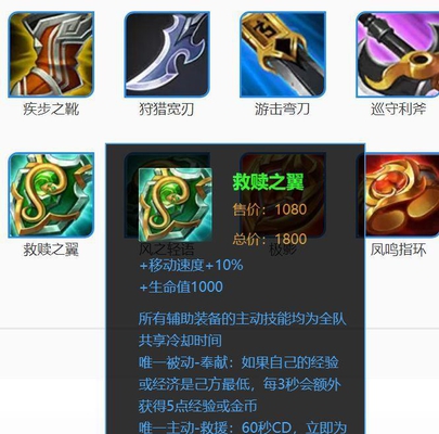 第六个是救赎之翼 。救赎之翼一般都是辅助出,用来保护C位,如果辅助自己瞬间被打成残血,也可以给自己套个护盾。除了辅助,关羽也是很适合出这件装备的。