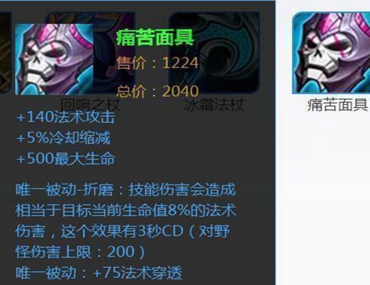 第一名是很多输出型法师必出的:苦痛面具!而所有法术装备里面出场率最高的是痛苦面具,这个装备可以说是非常全面的,既能加法术攻击还能降冷却,同时也能加生命。外加两个被动让法师的输出是大大提高,无论是前期加的法术穿透还是后期的折磨效果,都让法师的伤害更上了一层楼。