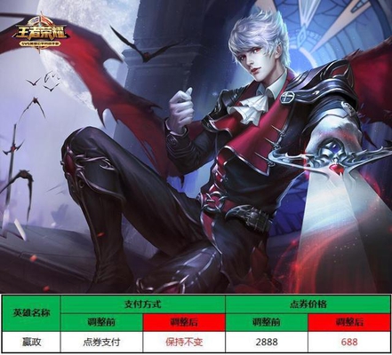 解析:因为内测时嬴政贼强势,所以刚上架时定价是2888点券,从2017年10月12号官方才将价格调整为现在的688点券。