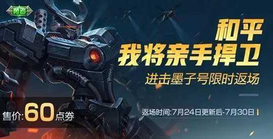 墨子6元皮肤限时返场,这款皮肤的性价比很高,拥有淡红色技能特效,不过墨子目前比较冷门,已经没有了之前的高爆发,只留下了超强控制。