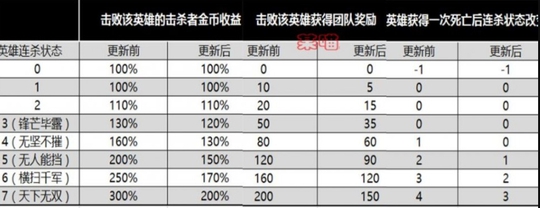 最后是针对本赛季献祭流打法的击杀经济奖励调整,直接击杀的金币奖励大幅降低,最高的超神终结降低两百金币。同时团队额外奖励也降低了最多五十金币每人,连杀状态终结后降幅提升,超神被连杀两次后清零。另外边境突围模式开放孙策英雄。