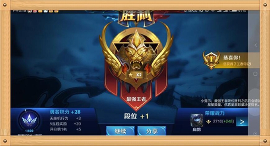 前面介绍的截图都是随缘,下面第五张图才是我们大家想要的,玩这么久的王者荣耀第一次上到了王者,以前一直发誓上到王者就不玩了,然后苦练几个月终于实现了这个目标,那么现在的你还在玩吗?