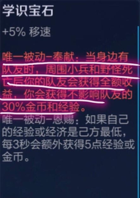 我们可以明确的看到,辅助宝石的特效就是和队友在一起的情况下,是不会影响队友的经验和金币收益的,而且出宝石的英雄还会获得额外的30%金币和经验,等于就是出了宝石射手英雄不会受到影响,辅助英雄虽然会被压制的比不出宝石时候收益低,但对团队来说,总收益等于是额外增加了30%。