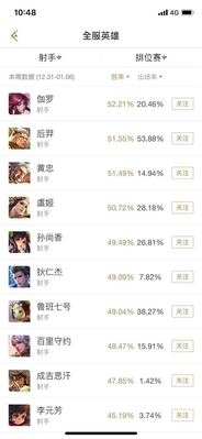 射手榜第一名是 伽罗,52.21%的胜率,20.46%的出场率 。之所以着重提一下射手榜,是因为下赛季射手普遍加强,射程增加,下路的地形变化,使得边路射手射手生存空间更加安全,射手逐渐走向边路对于胜率的变化自然影响很大,目前的前5名排名是伽罗、后羿、黄忠、虞姬、孙尚香,下周我们再看看是否有变化。至少小饭觉得,狄仁杰胜率应该会有所上升。