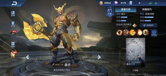 盘古在古代神话中是开天辟地的神,游戏中的盘古肌肉满满,很强壮,手持巨斧,很有开天辟地的气势。